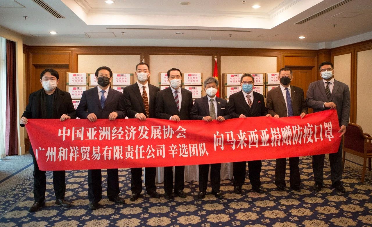 3月18日,中国亚洲经济发展协会向马来西亚捐赠10万只防疫口罩移交仪式在马来西亚驻华大使馆顺利举行。马来西亚大使拿督拉惹•努西尔万阁下亲自受赠。参加仪式的马方使馆人员有大使拿督拉惹•努西尔万、经济参赞施志光、海关参赞尼克•马兹迪等;参加仪式的协会领导有会长权顺基、执行会长刘红路、常务副会长孙铁成、杨书华,东北亚部部长朴龙日等,协会中马合作委员会赵光明会长为捐赠活动做了积极的协调工作。