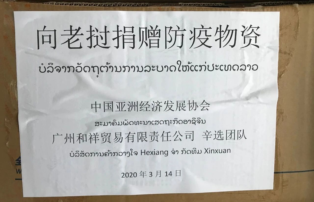3月14日,30万只由亚经协捐赠给老挝人民民主共和国的防疫口罩,从北京发往老挝后,再分发给老挝国防部、外交部、公安部、中国驻老挝大使馆等部门。