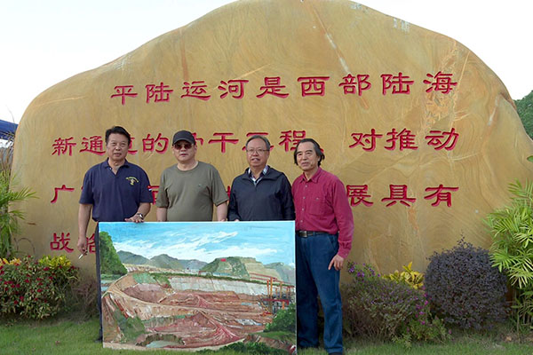 为了呈现建设现场的恢弘景象和磅礴气势,艺术家们亲临工程建设第一线,工地就是他们无限延伸的创作空间。此时北方已经步入寒冬,但是广西当地的气温仍高达33摄氏度以上,不过这些都无法阻挡艺术家们高涨的创作热情。他们不顾舟车劳顿,无惧水土不服;他们头顶着烈日,置身于喧嚣的工地;他们仍然全神贯注地执笔创作。