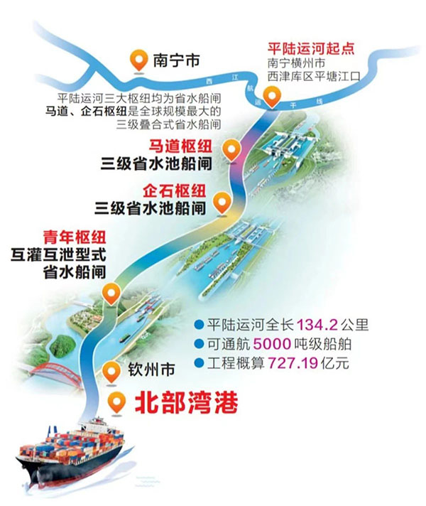 “平陆运河”是新中国成立以来建设的第一条通江达海的运河工程,也是西部陆海新通道的骨干工程以及加快建设交通强国的标志性工程。运河始于南宁横州市西津库区平塘江口,经钦州灵山县陆屋镇沿钦江进入北部湾,全长134.2千米,全线按内河一级航道标准建设,可通航5000吨级船舶。运河建成后,不仅对促进广西区域发展具有重要意义,而且对西南部发展也具有重要战略意义。