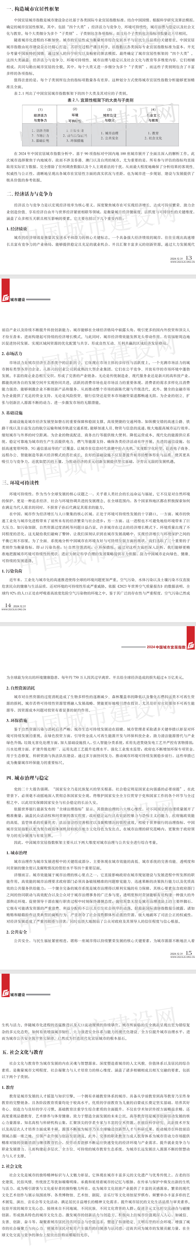 中国宜居城市指数是城市建设杂志社基于各类国际专业宜居指数标准,结合中国国情,根据科学研究及算法模拟, 确定的城市宜居性框架。其中,包括“四个大类”:经济活力与竞争力、环境可持续性、城市治理与稳定以及社会文 化与教育。每个大类细分为多个“子类别”,子类别包含各项指标,而且每个子类别包含指标项数量也不尽相同。