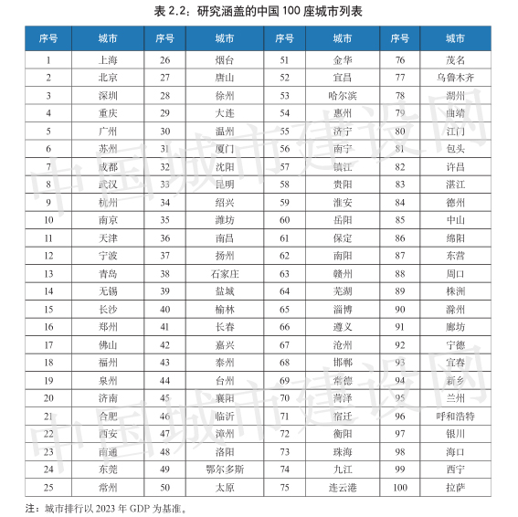 表2.2详细列出了本研究选取的100座中国城市清单。实验研究数据以2022年为基准,需要特别说明的是, 本研究若存在数据缺失情况,则以2021年数据为准;同时,研究范围未涵盖香港、澳门以及台湾地区。