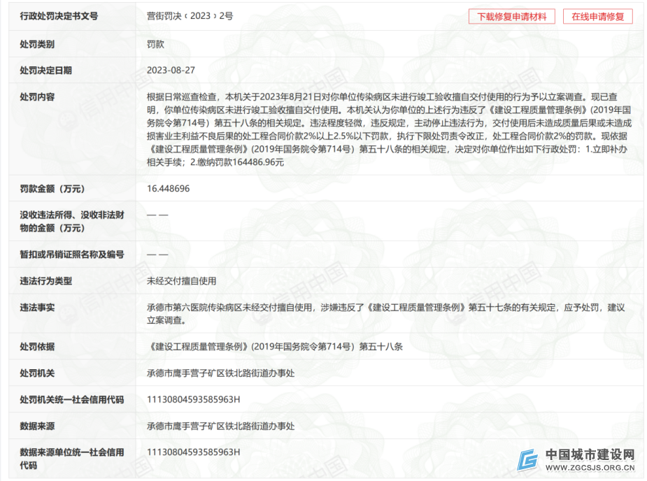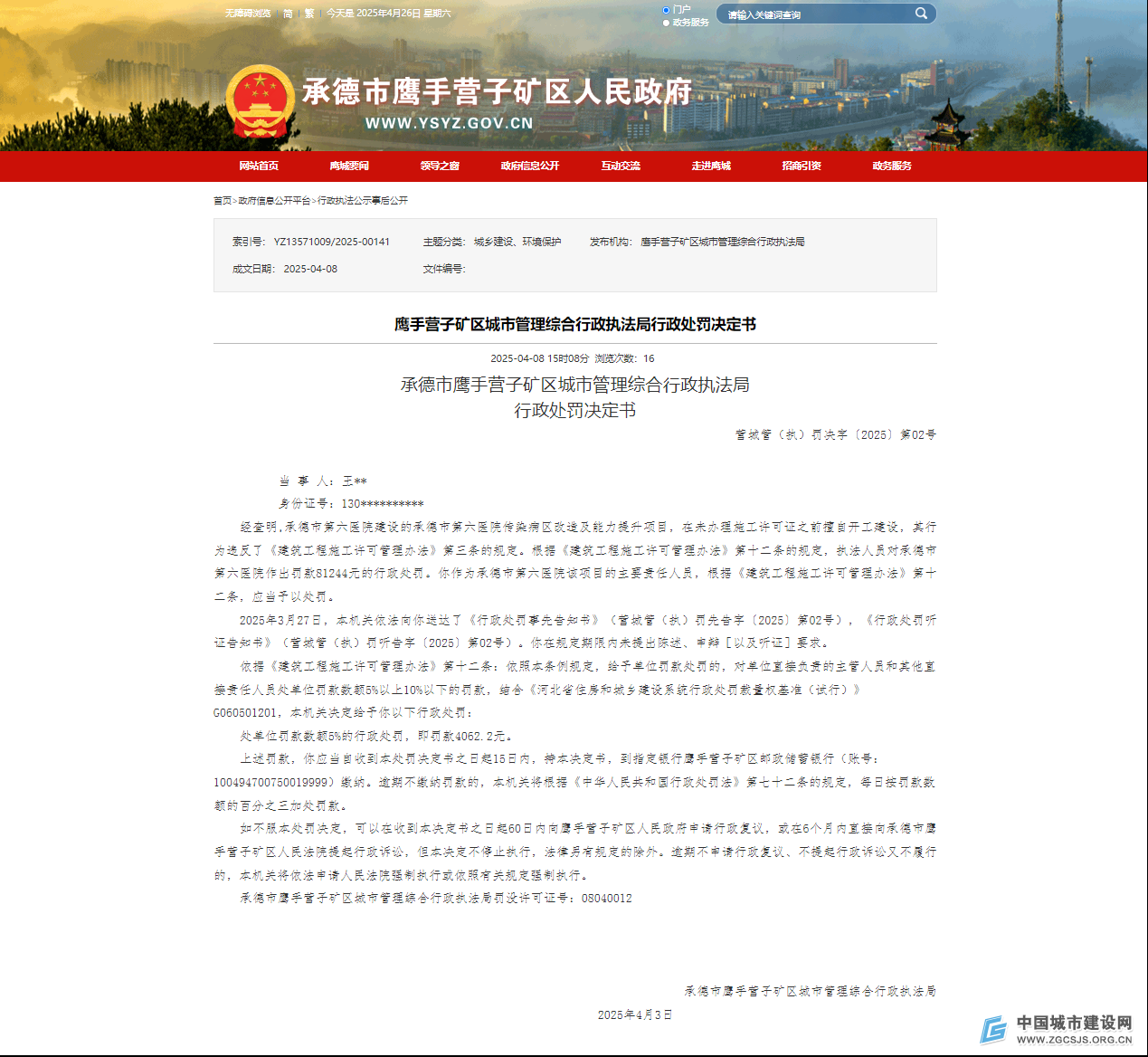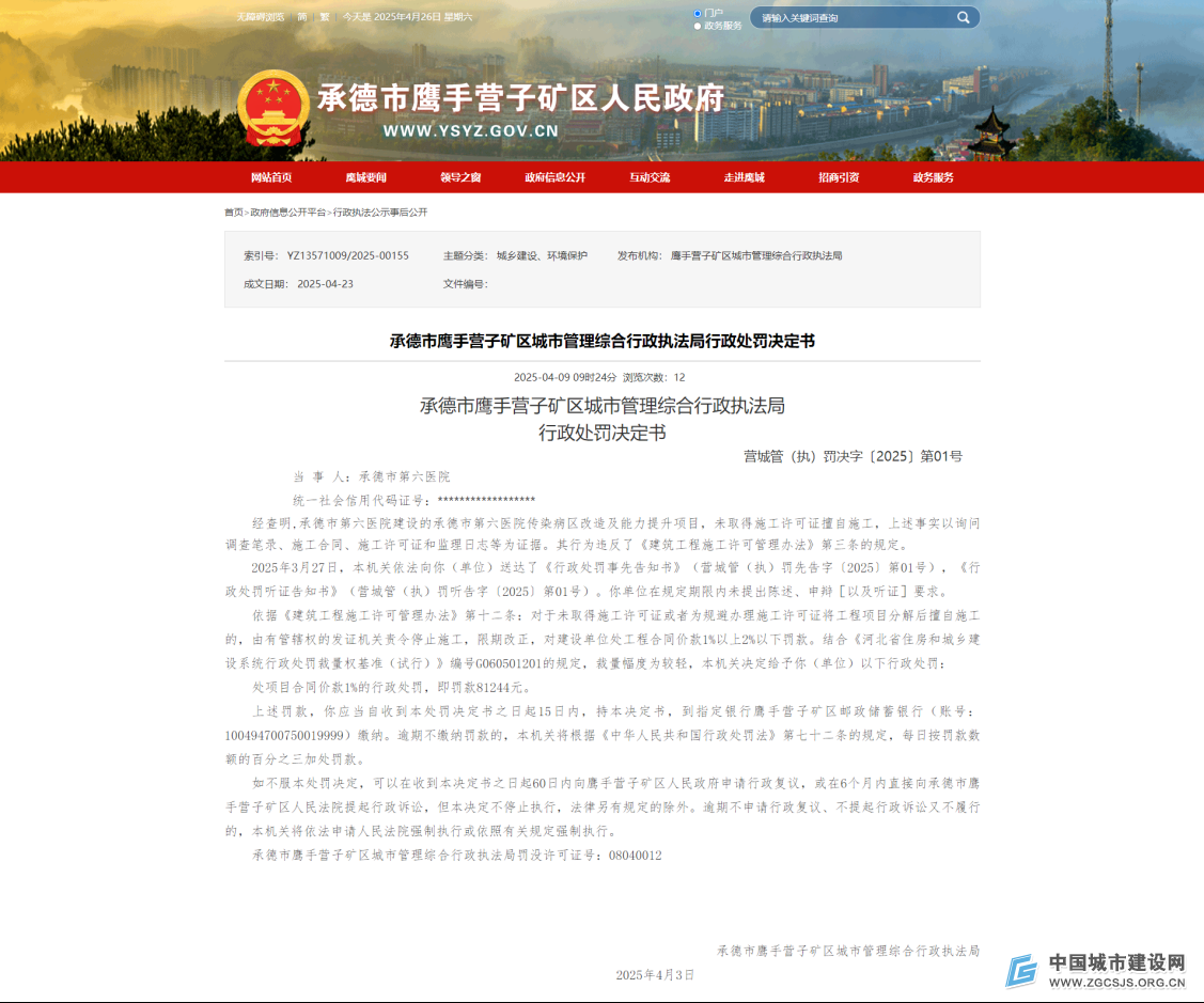 文号“营城管﹝执﹞罚决字﹝2025﹞第01号”行政处罚决定书显示:“承德市第六医院建设的承德市第六医院传染病区改造及能力提升项目,在未办理施工许可证之前擅自开工建设,其行为违反了《建筑工程施工许可管理办法》第三条的规定,根据《建筑工程施工许可管理办法》第十二条。应当予以处罚。”