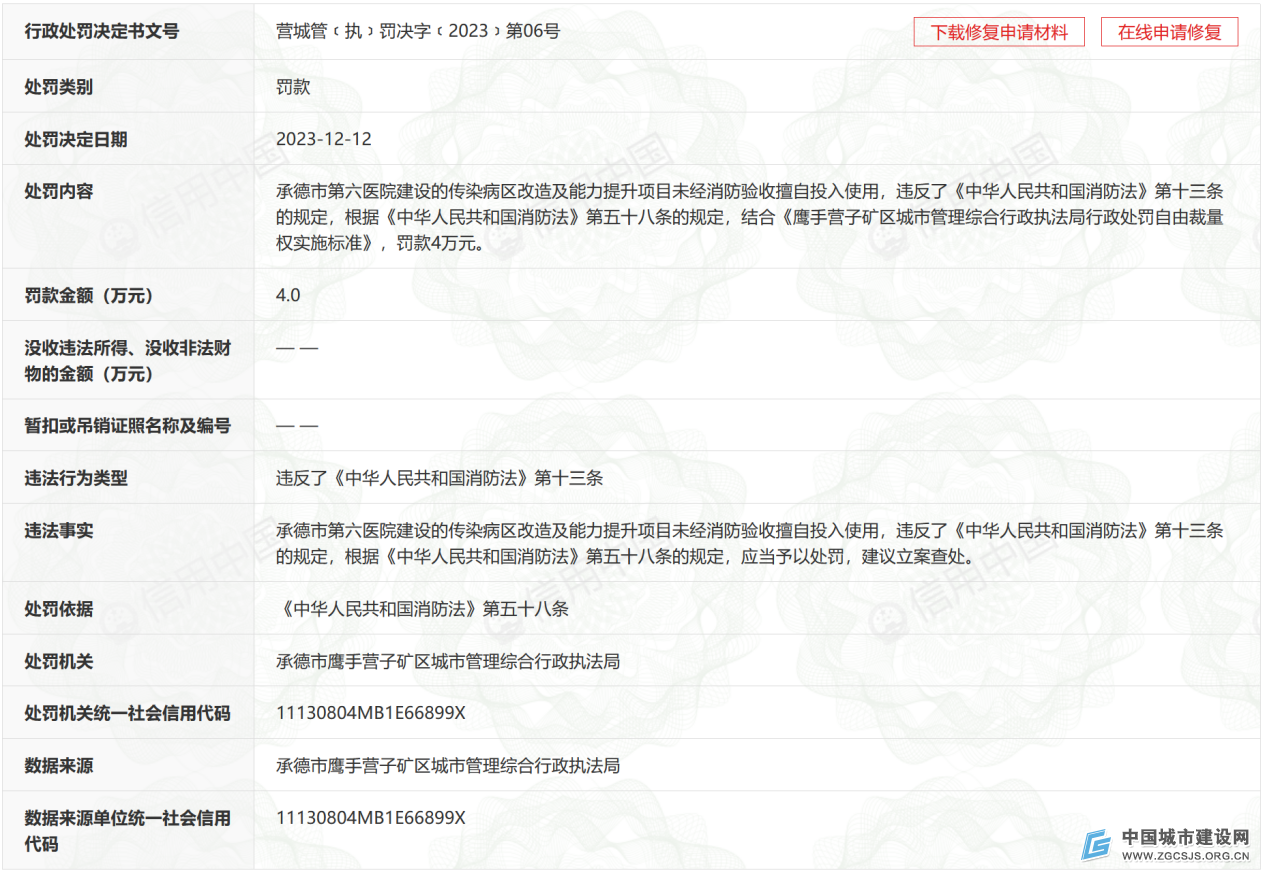 2023年12月12日,承德市鹰手营子矿区城市管理综合行政执法局对承德市第六医院建设的传染病区改造及能力提升项目未经消防验收擅自投入使用,违反了《中华人民共和国消防法》第十三条的规定。