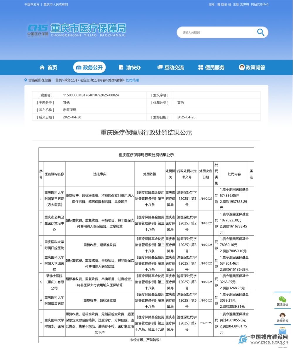 2025年4月28日,重庆市医疗保障局官网公示了多家医疗机构存在重复收费、超标准收费、超医保限制结算等违法行为。其中,重庆医科大学下属5家医院上榜,重庆市公共卫生医疗救治中心及莱佛士医院(重庆)有限公司也在处罚名单之中。