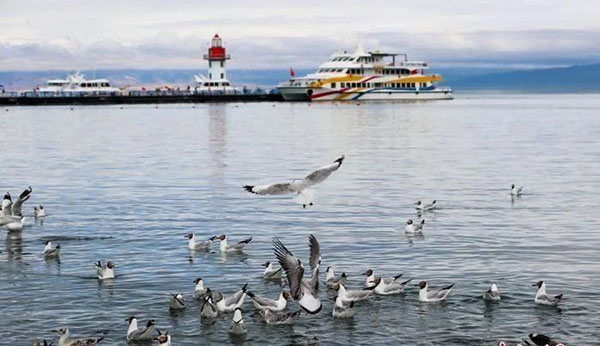 7月24日,水鸟在青海湖二郎剑景区湖面觅食。二郎剑景区位于青海省海南藏族自治州共和县。盛夏时节,青海湖宛如一颗蓝宝石镶嵌在青藏高原。青海湖裸鲤和水鸟在此和谐共生,绘就出一幅生态与人文交织的活力画卷。