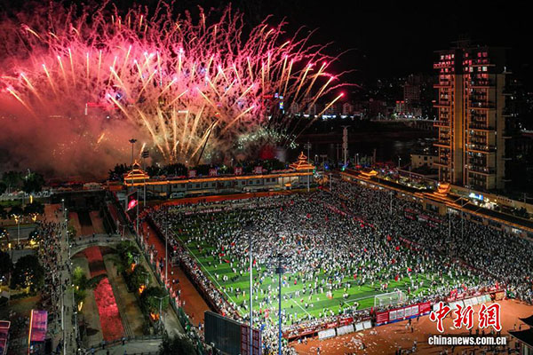 7月26日晚,“2025感恩·雄起贵州’超’力量!”贵州“村超”暖心重启文艺演出在贵州省榕江县“村超”球场举行,该演出分为“铭记抗洪”“中国脊梁”“风雨同舟”“希望之光”“启航新篇”五个篇章,抗洪原创歌曲联唱、无人机编队表演、大型烟花秀等竞相上演。图为航拍大型烟花秀。