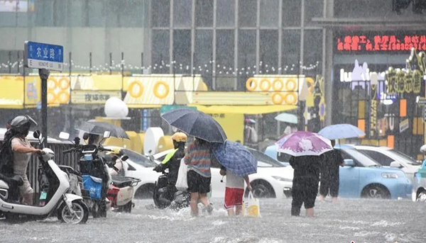 8月7日,受强对流云团缓慢少动影响,河南省郑州市遭遇暴雨天气,部分道路出现积水情况。图为市民雨中出行。