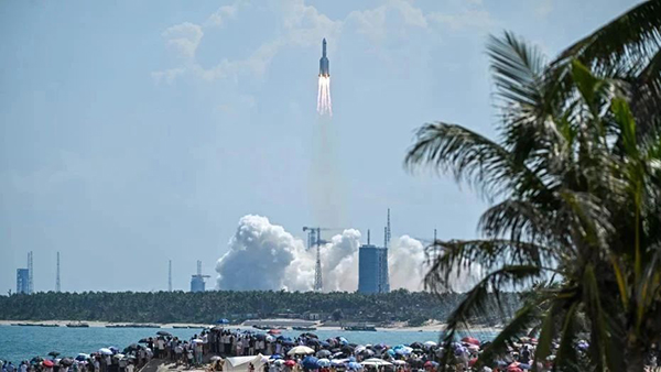 8月13日14时43分,中国在文昌航天发射场使用长征五号乙运载火箭/远征二号上面级,成功将卫星互联网低轨08组卫星发射升空,卫星顺利进入预定轨道,发射任务获得圆满成功。图为民众在文昌淇水湾海滩观看长征五号乙运载火箭/远征二号上面级点火升空。