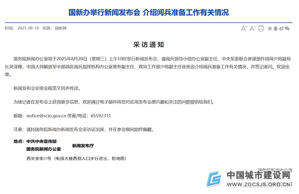 国务院新闻办公室将于2025年8月20日(星期三)上午10时举行新闻发布会,请阅兵领导小组办公室副主任、中央军委联合参谋部作战局少将副局长吴泽棵,中国人民解放军中部战区阅兵指挥机构办公室常务副主任、政治工作部少将副主任徐贵忠介绍阅兵准备工作有关情况,并答记者问。