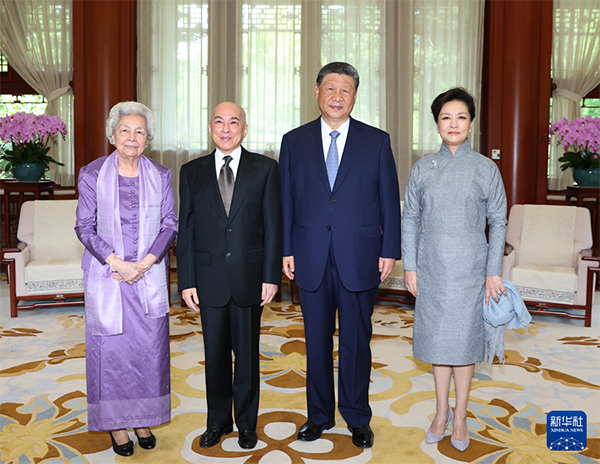 8月26日上午,国家主席习近平和夫人彭丽媛在中南海亲切会见柬埔寨国王西哈莫尼和太后莫尼列。