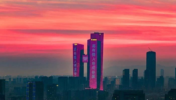 8月27日晚,江苏南京,河西地区地标建筑楼体亮起“在南京 说爱你”“情满七夕 爱在金陵”“愿有情人终成眷属”等字样,为即将到来的七夕节增添浪漫氛围。