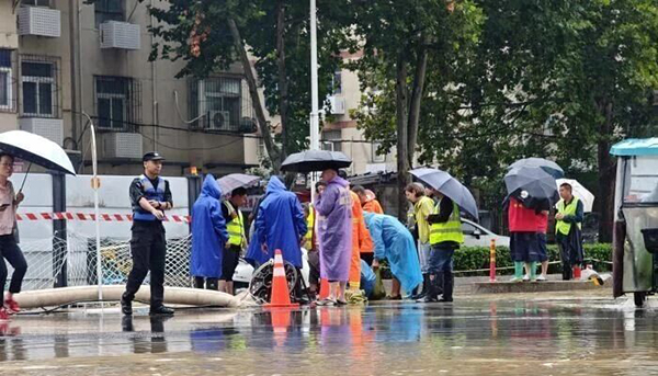 9月11日,河南郑州出现中到大雨,局部暴雨天气。图为郑州市汝河路街道办联合应急力量,合力用“龙吸水”加速排涝。