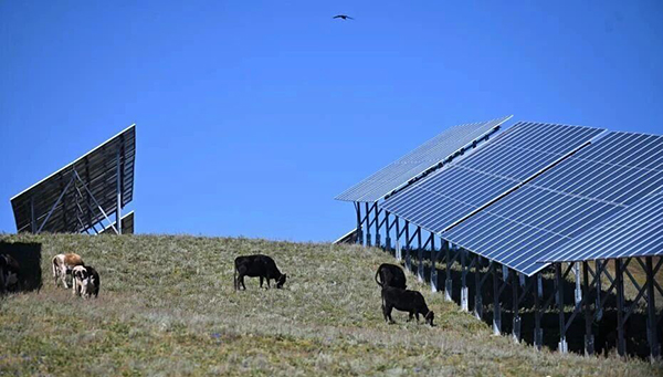9月14日,在四川省甘孜州乡城县超4000米海拔的正斗光伏基地内,一群牦牛在光伏板下吃草,整齐排列的光伏组件下成了牦牛的“天幕餐厅”。这套“牧光互补”的发展新模式成为了川西高原上一道独特的风景。提升高度后的光伏支架为光伏板下的牧草生长和牲畜养殖提供了足够空间,在光伏板的遮挡下,牧草长势得到了较大改善。