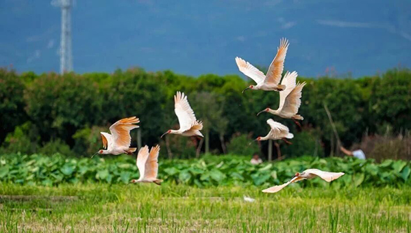 九月中旬,陕西省汉中市城固县大面积水稻成熟进入收割期,收割后的稻田里稻虾、稻鳅等食物较多,吸引成群的朱鹮觅食嬉戏、飞舞盘旋,构成一幅自然和谐的田园美景。图为陕西省城固县朱鹮在稻田上低飞。