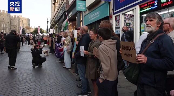 因对美国多项政策不满,数千名抗议者17日下午在伦敦市中心示威游行,对正在英国进行国事访问的美国总统特朗普表达抗议。当天,特朗普在温莎城堡会见英国国王查尔斯三世。