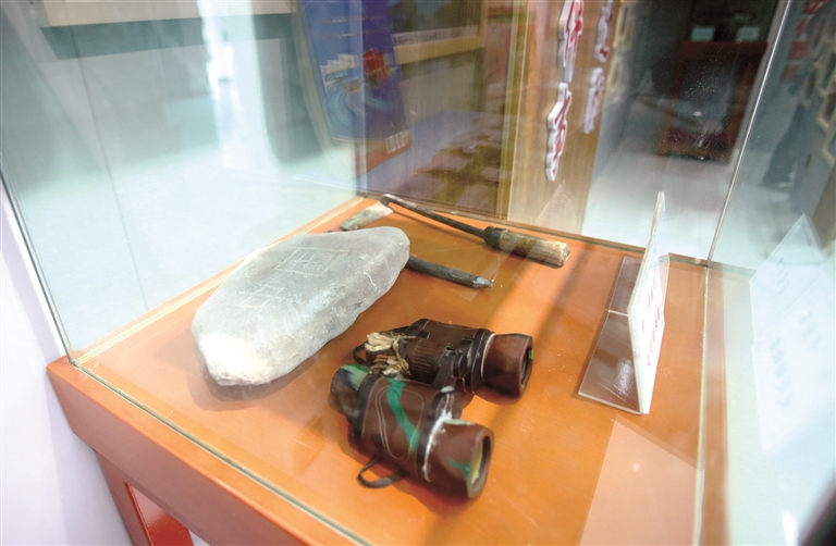 图为“人民楷模”布茹玛汗·毛勒朵巡逻边境时刻下的“中国石”和使用的工具。 新华社记者 程丽 摄