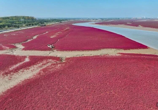 9月25日,山东青岛,黄岛区洋河入海口的红海滩碱蓬草灿若锦霞。