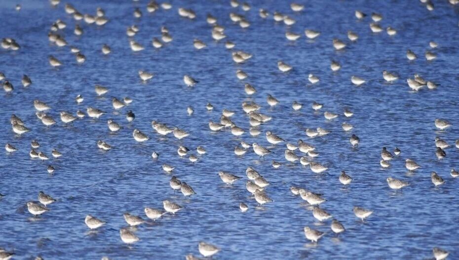 10月22日,山东青岛,秋日时节,成群候鸟翔集青岛市城阳区河套街道滨海湿地,绘就一幅美丽的生态画卷。图为成群灰斑鸻在浅水区栖息。