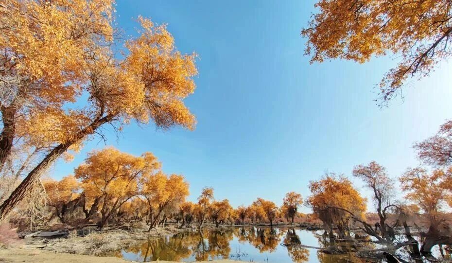 11月初,新疆沙雅县470万亩胡杨进入年度最佳观赏期。塔里木河河水如绿丝带缠绕其间,金黄的枝叶倒映水中,壮美景观吸引游客观赏。