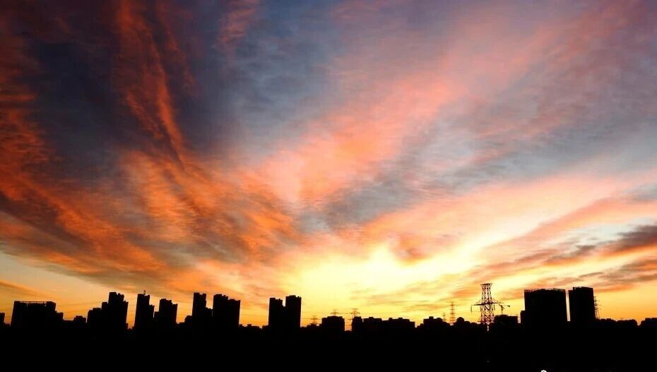 11月20日,初冬时节,北京天空的朝霞绚烂壮丽、十分震撼,宛若一幅浓墨重彩的油画,美不胜收。