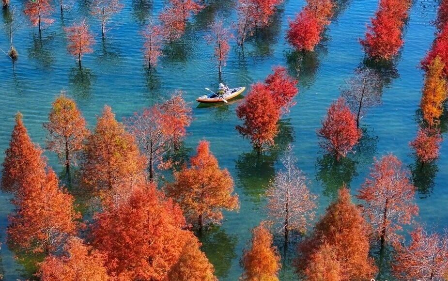 11月22日,浙江省湖州市长兴县龙山街道桃花岕森林公园,水杉林五彩斑斓,吸引游客前来赏景游玩。