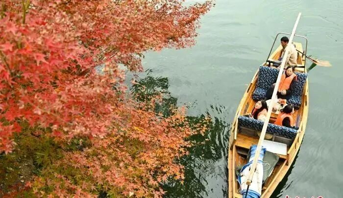 12月2日,游人乘船观赏苏堤红枫。时值江南冬日,浙江杭州西湖苏堤、北山街、太子湾公园等地呈现出红枫似火、梧桐金黄景象,色彩斑斓的“限定款”季节美景吸引游人观赏。