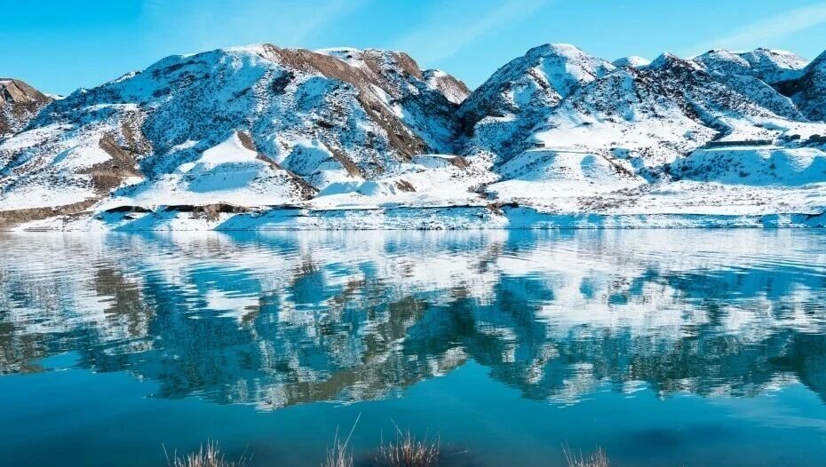 近日,新疆昌吉回族自治州,头屯河谷雪景。楼庄子水库湖水如冰蓝色玉石,雪山倒映水中,构成一幅完美画面。