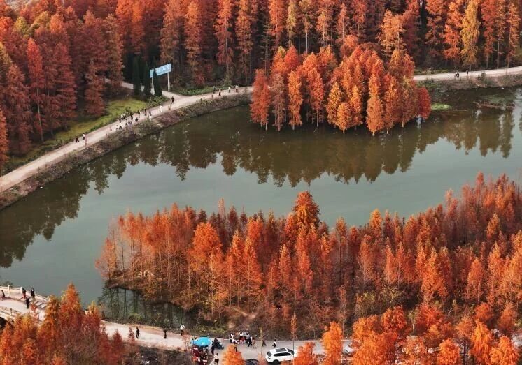 初冬时节,在位于河南省东南部固始县的杨店林区(国家级公益林),连片的水杉经霜露浸染,换上了丹红的新装。阳光穿过枝叶,洒落下斑驳的光影,为冬日的林区增添了几分暖意与诗意。