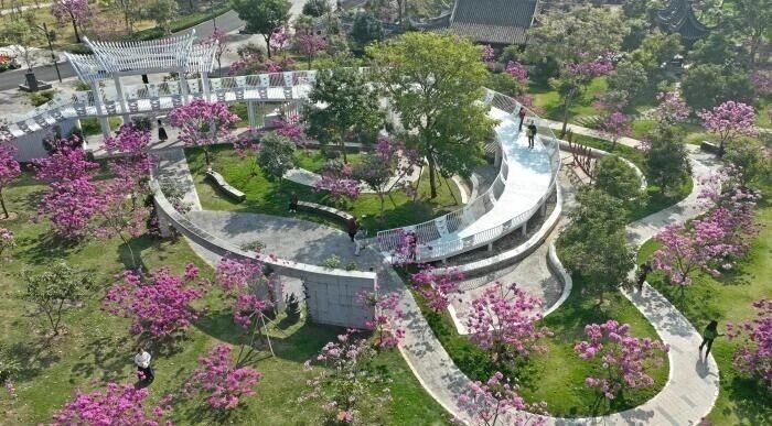 近日,广西南宁园博园紫花风铃迎来盛放期,红色、粉色花簇缀满枝头,独特的冬日“春景”吸引了许多民众前来游玩。图为航拍园博园里的紫花风铃花。