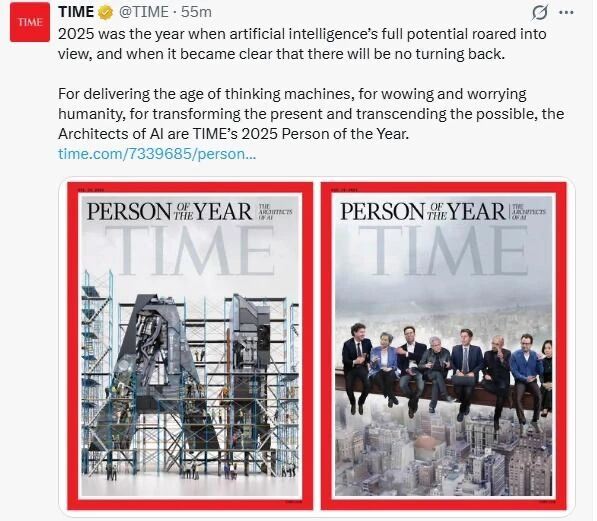据美联社报道,当地时间11日,“人工智能(AI)缔造者们”被美国《时代》周刊评为2025年年度人物。《时代》周刊表示,“因为开启‘思考型机器’的时代、让全人类惊叹亦忧虑、改变当下并突破可能性的界限,‘AI的缔造者们’当选为《时代》2025年年度人物。”