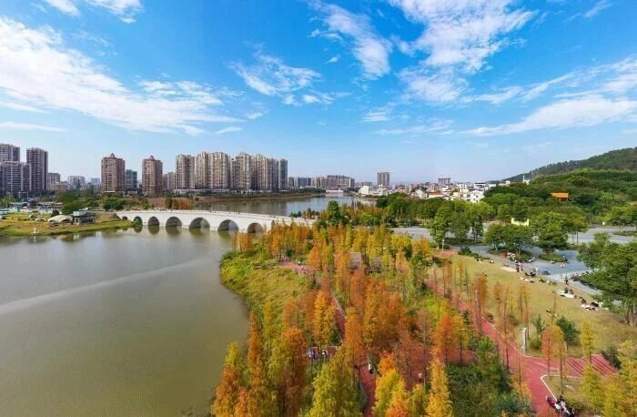 近日,广西梧州市苍海公园水杉由绿转红,层林尽染。彩色步道、湖水与石拱桥相映成趣,构成一幅斑斓的冬日画卷,吸引不少市民游客前来驻足赏景、拍照打卡。图为市民游客在广西梧州苍海公园中游玩。
