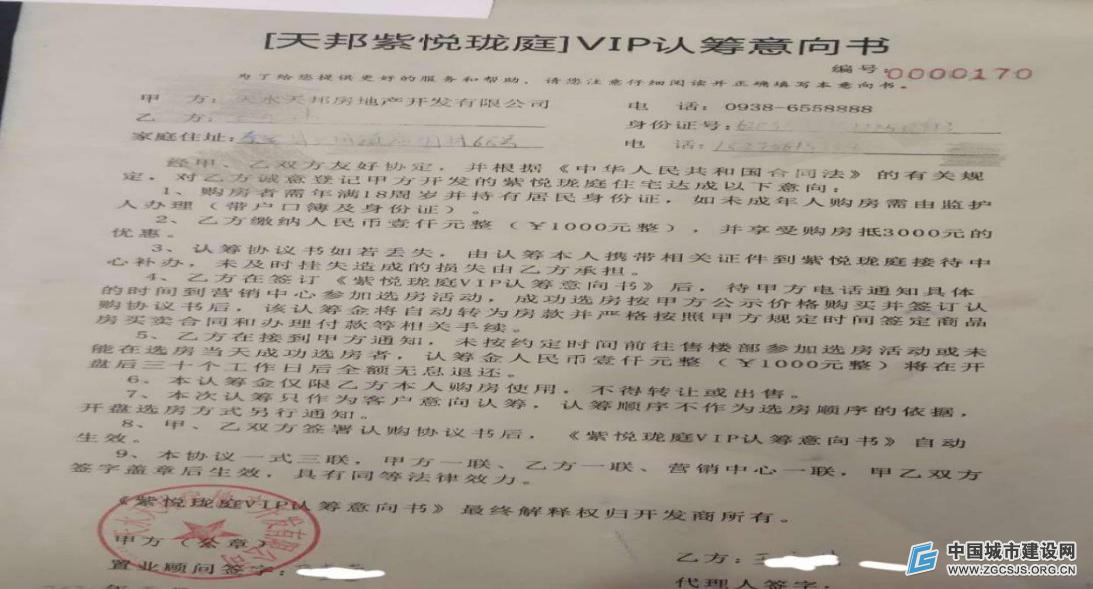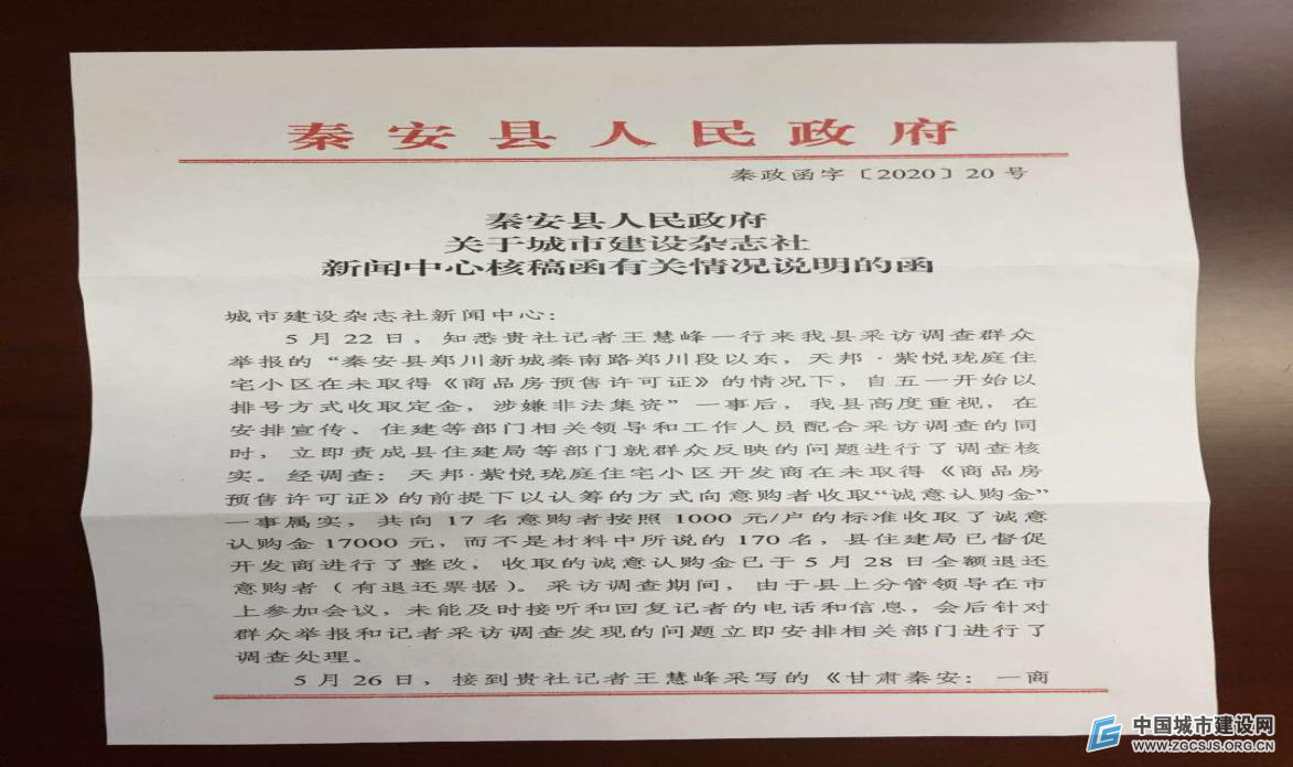 6月4日,我社收到秦安县人民政府回函。回函内容显示:对于“天邦·紫悦珑庭项目”,未取得《商品房预售许可证》的前提下,以认筹的方式向意购者收取意向金一事属实,县住建局已责成开发商整改,并退还所收意向金,并对这种行为进行了严肃查处。