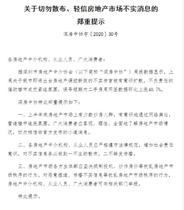 中新网客户端7月8日电 深圳市房地产中介协会7日发布通知称,据深圳市房地产中介协会周报数据显示,上周关于深圳市即将出台房地产调控新政的不实传言被有意识扩散,不负责任的催动楼市成交紧迫氛围,误导短期内二手房周网签数据环比上涨40.7%。深圳市房地产中介协会提示:上半年来房地产市场上有少数炒房人群,有意识地通过网络舆论,营造楼市追涨氛围。广大消费者应客观、理性、全面地了解房地产市场情况,切勿相信非官方发布的小道消息。
