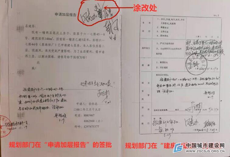 图为:规划部门对同一房屋加层申请,对两个不同加层要求都予以签批。