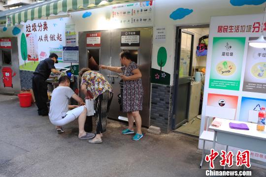 8月7日,市民在小区内进行垃圾分类,并将分好垃圾投放至指定的垃圾桶内。《上海市生活垃圾管理条例》正式实施以来,上海市已完成1.7万个分类投放点改造和4万余只道路废物箱标识的更新。 中新网发 殷立勤 摄