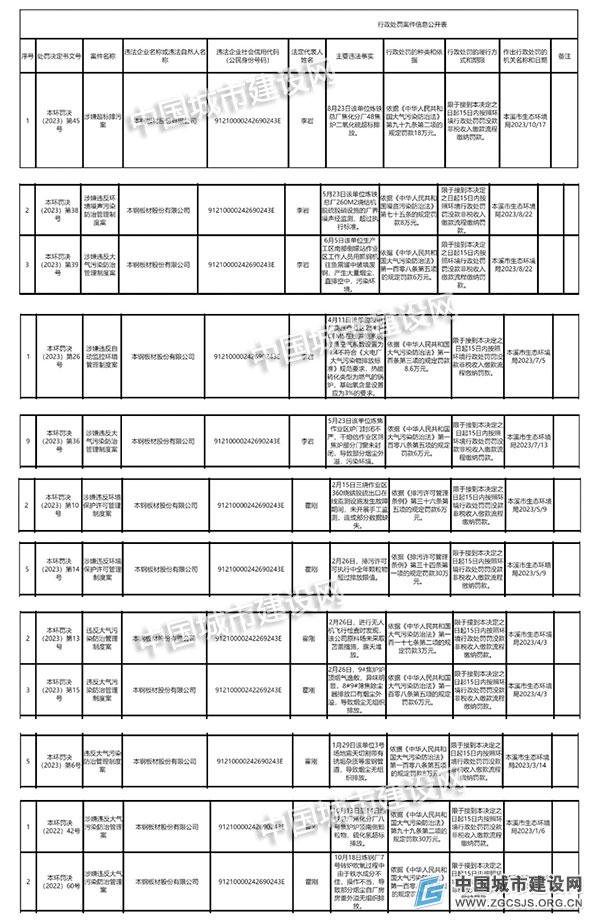 本溪市生态环境局官网显示,自2023年1月6日至2023年10月17日,本钢板材股份有限公司因环保问题被本溪市生态环境局做出行政处罚共计12次,共计罚款金额139.6万元。具体处罚信息如下:
