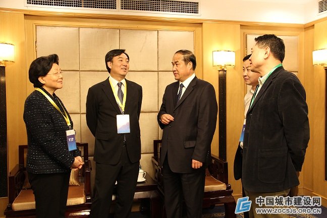 原商务部副部长马秀红(左一)、外交部副部长翟隽(左二)、保定市市长马誉峰(左三)、本社社长王克剑(右)等领导在活动现场交谈