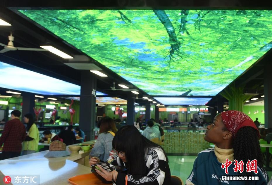 2019年3月17日,在浙江农林大学食堂里拍摄到“四季美景”。 近日,位于杭州的浙江农林大学的一食堂在翻新之后,在吊顶安装了四块超大尺寸幕布,投射四季自然风光,同学们可边吃饭边抬头欣赏四季美景,受到不少学生的欢迎。图片来源:东方ic
