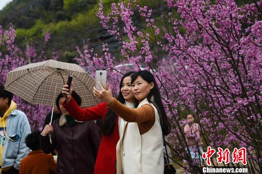 3月25日,湖南永州江永县松柏瑶族乡野生紫荆花核心景观区,冒雨前来赏花的