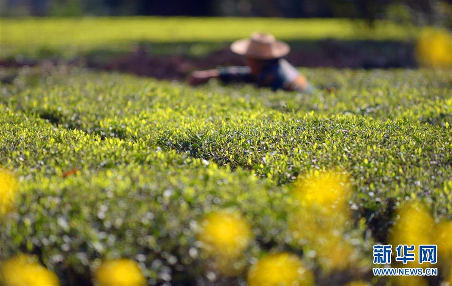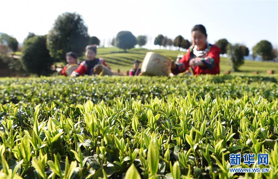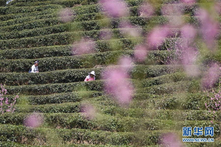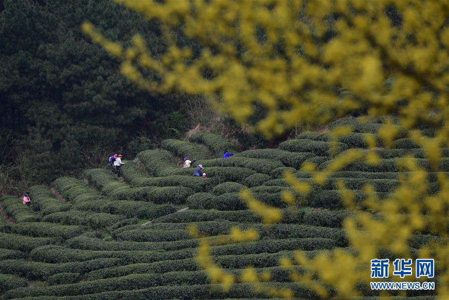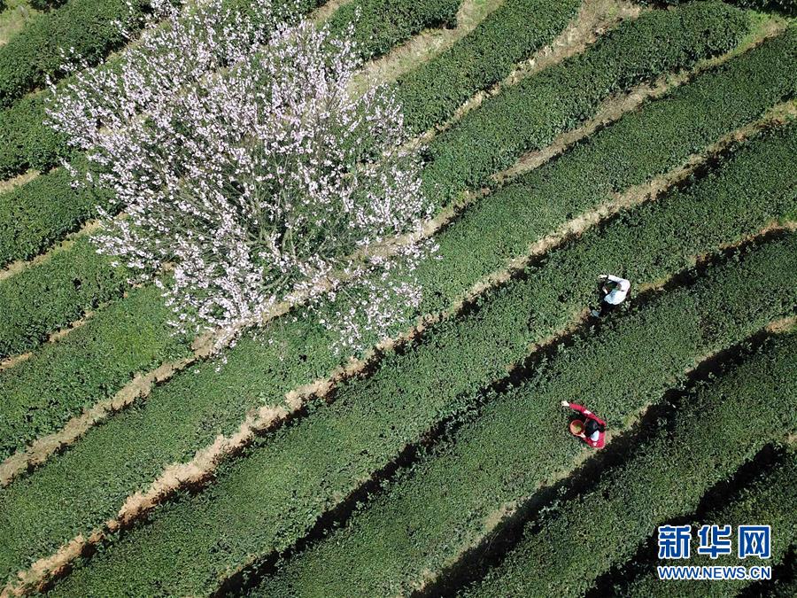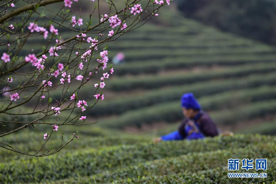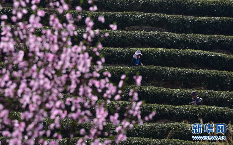 3月25日,湖北省恩施市屯堡乡花枝山村茶农在恩施玉露茶园内采摘春茶。三月春暖,各地茶园春意盎然,茶农们忙着采摘春茶,构成一幅幅美丽的画卷。新华社发(文林 摄)