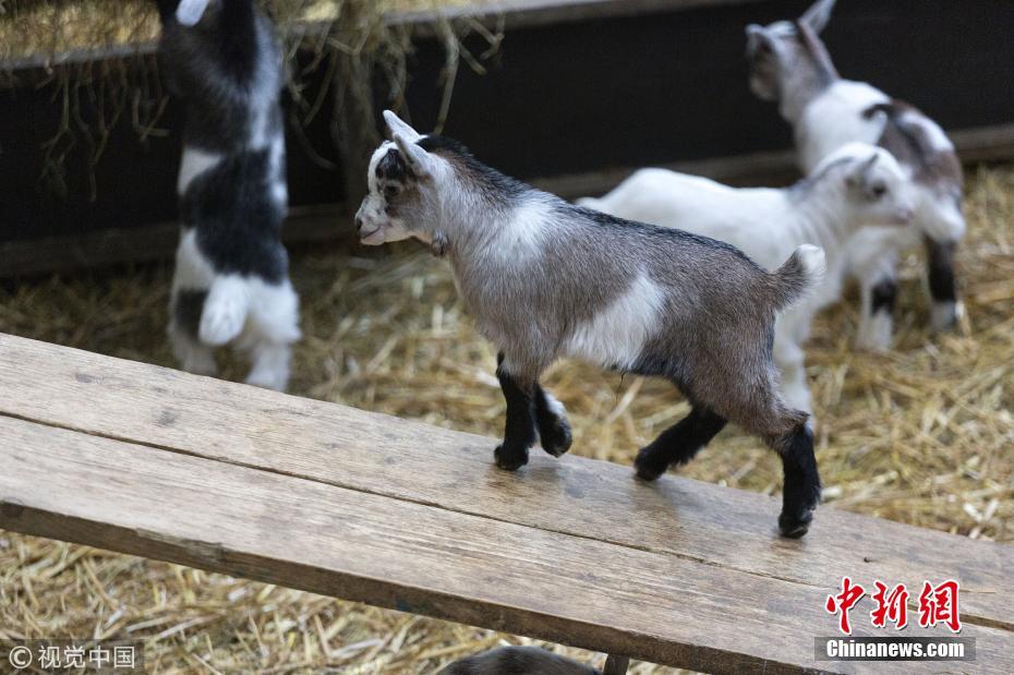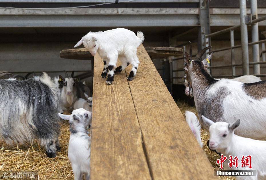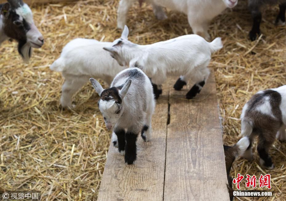 当地时间2019年3月27日,英国南约克郡巴恩斯利坎农霍尔农场,一群4周大的侏儒山羊羔在农场主搭建的木“滑梯”上玩耍。这些小山羊轮流爬上木板搭成的斜坡,然后用它们的蹄子一路滑下来。 图片来源:视觉中国