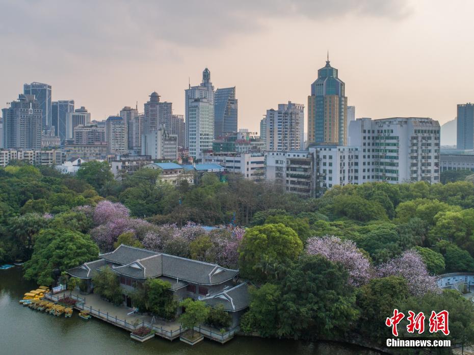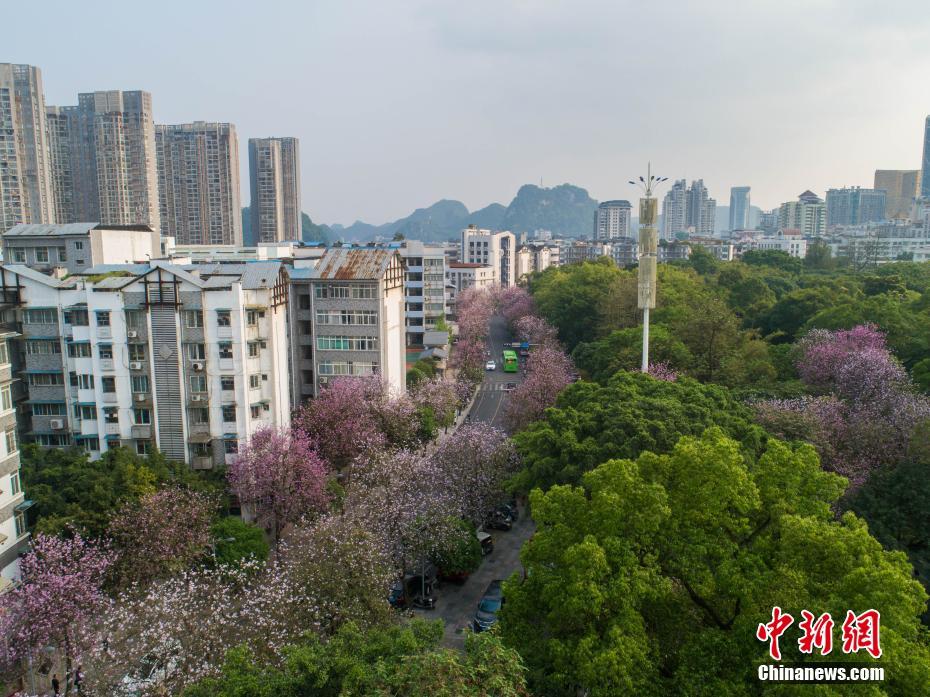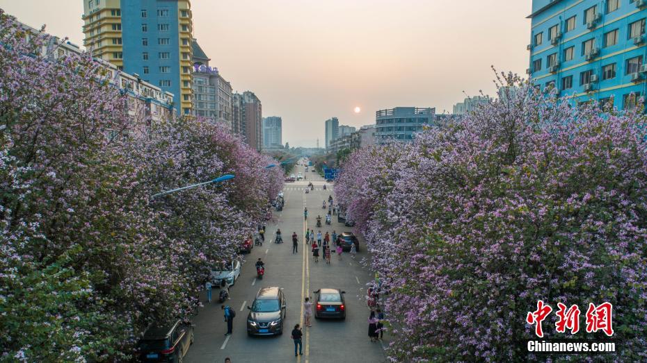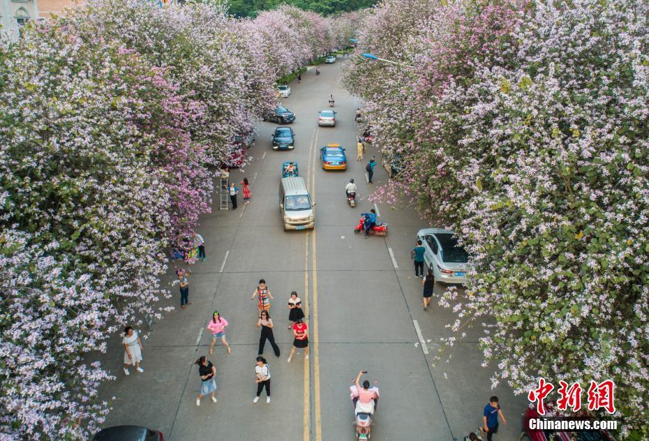 4月9日,广西柳州市天气晴好,城市内种植的27万株紫荆花进入盛花期。不少道路被粉色的花朵笼罩,如同被施上一层“粉黛”。