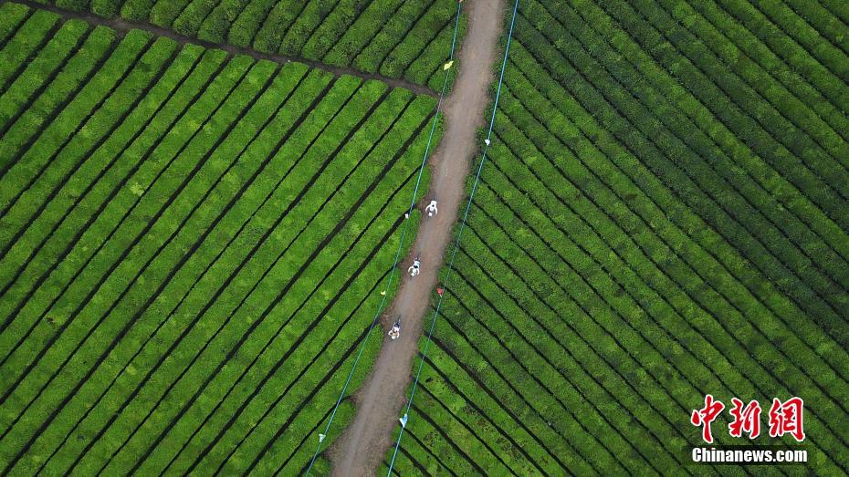 4月14日,航拍自行车选手在贵州湄潭“中国茶海”景区中竞技。当日,2019“多彩贵州”自行车联赛(湄潭站)暨遵义·中国茶海自行车赛第二日赛程——“山地越野赛”在贵州省遵义市湄潭县“中国茶海”景区举行。 中新社记者 瞿宏伦 摄