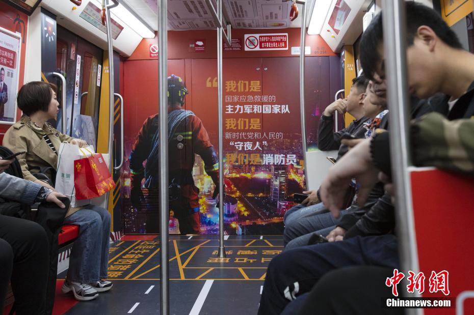 4月17日,乘客乘坐消防主题地铁列车。当日,哈尔滨市举行“4.17消防宣传活动暨地铁消防主题列车启动仪式”。据了解,消防主题地铁列车共6节车厢,每节车厢一个主题,通过生动的动漫形象,向民众普及消防知识。中新社记者 吕品 摄
