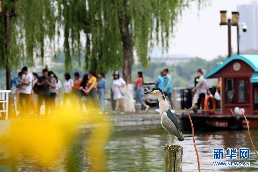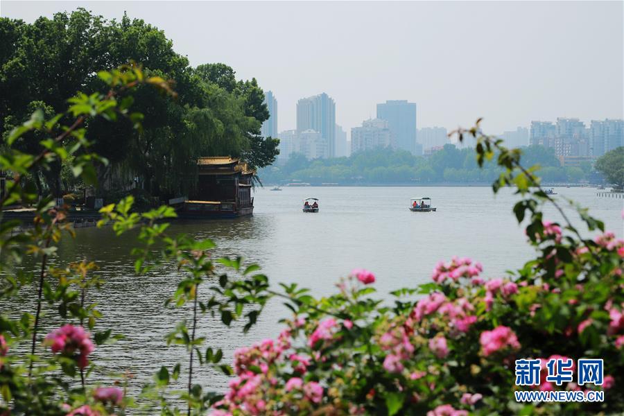 5月11日,游客在济南红叶谷风景区游玩(无人机拍摄)。 初夏的泉城济南翠绿欲滴、泉水潺潺,市民和游客在大明湖、泉水公园等景区徜徉游览,构成一幅幅美丽图画。 新华社发(李信君 摄)