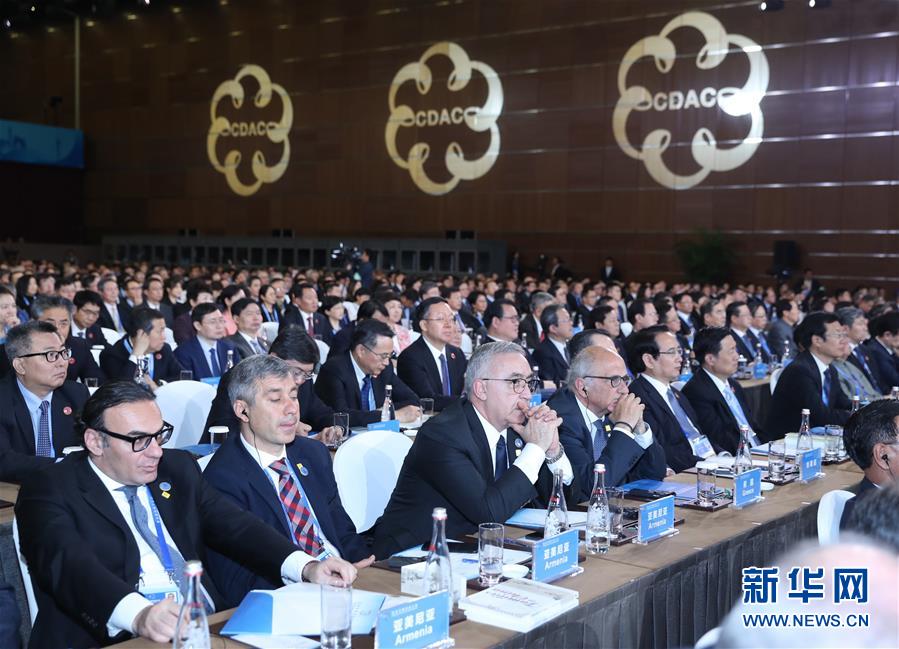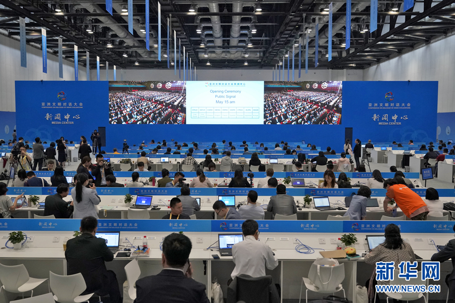 5月15日,媒体记者在大会新闻中心关注开幕式。 当日,亚洲文明对话大会开幕式在北京国家会议中心举行。新华社记者 沈伯韩 摄