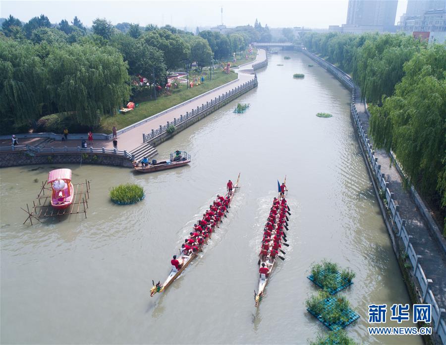 6月4日,桐乡市洲泉镇的两支龙舟队在湘溪公园旁的河道中开展训练,他们将代表桐乡参加2019嘉兴端午民俗文化节的龙舟竞渡(无人机拍摄)。临近端午佳节,浙江省桐乡市洲泉镇在乡村、学校组织赛龙舟、做香包、传统曲艺表演等各类水乡传统民俗活动。传承和展示传统水乡民俗特色,营造传统民间文化氛围迎接端午佳节的到来。 新华社记者 徐昱 摄 图片来源:新华网