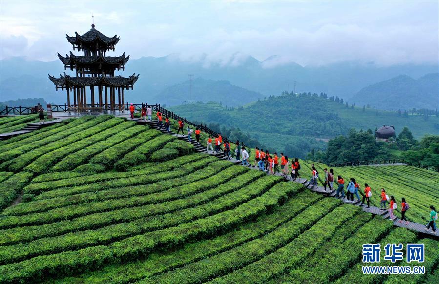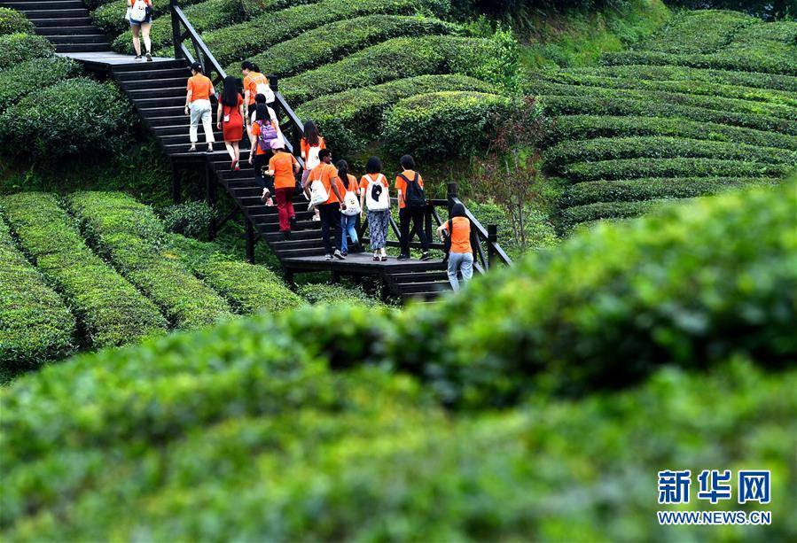 7月7日,游客在湖北省宣恩县万寨乡伍家台村的有机茶园里观光游玩。 小暑时节,湖北省恩施土家族苗族自治州宣恩县以伍家台村为中心的数万亩茶园里游客络绎不绝。人们到此观光游玩,体验传统茶文化。 新华社发(宋文 摄)