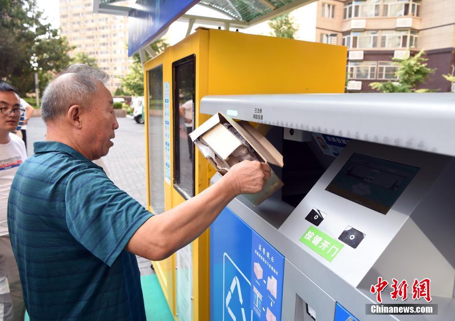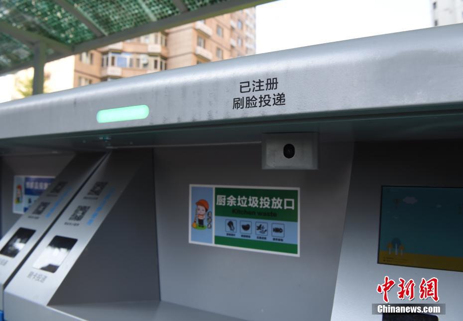 7月11日,北京市西城区新风街一号院居民小区内设置的新型分类垃圾桶及可供积分兑换的环保垃圾袋发放机引起路人驻足。据悉,这套不久前投放在该小区的垃圾系统,按北京市规定的垃圾分类对有害垃圾(红色)、其他垃圾(灰色)、厨余垃圾(绿色)和可回收垃圾(蓝色)进行对应收集,小区居民可以绑定对应的手机应用程序,享受“刷脸”扔垃圾、扔垃圾累计积分兑换垃圾袋等功能。中新社记者 侯宇 摄